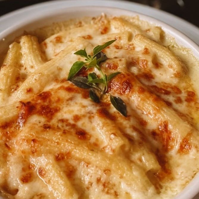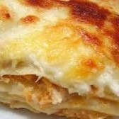 Serve 2 pessoas. Massa, mussarela, molho à bolonhesa, cobertura de molho branco. Gratinada.