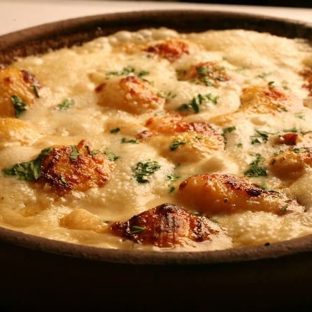 Molho especial criado pela casa, fundo de alcachofra recheado (pasta feita com queijo gruière, tomate seco e bechamel) e gratinado.