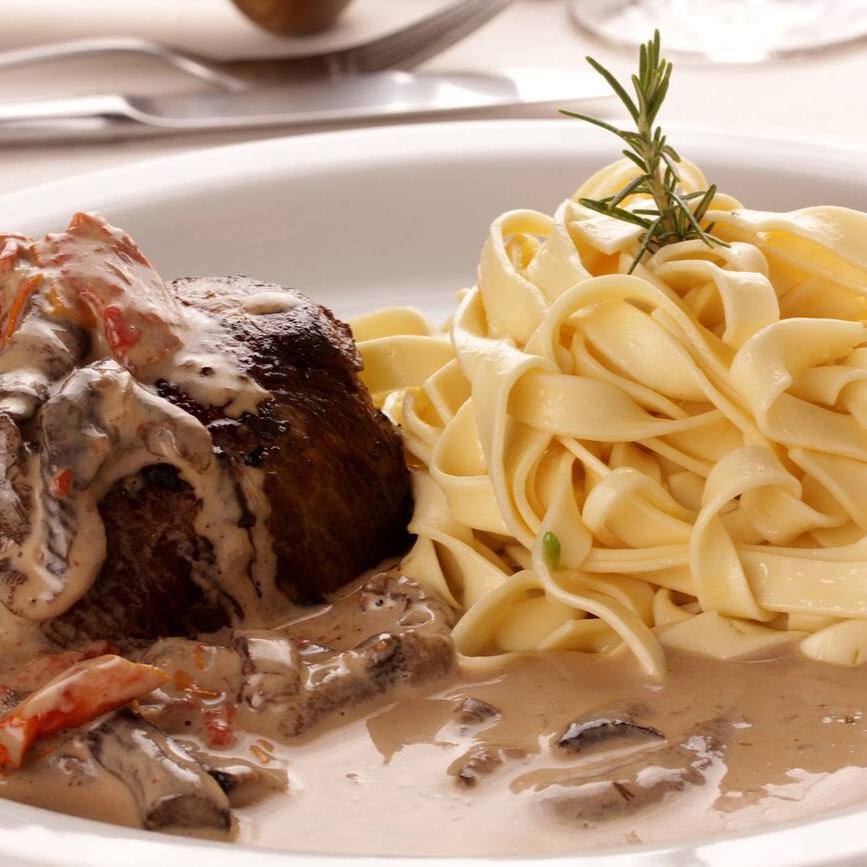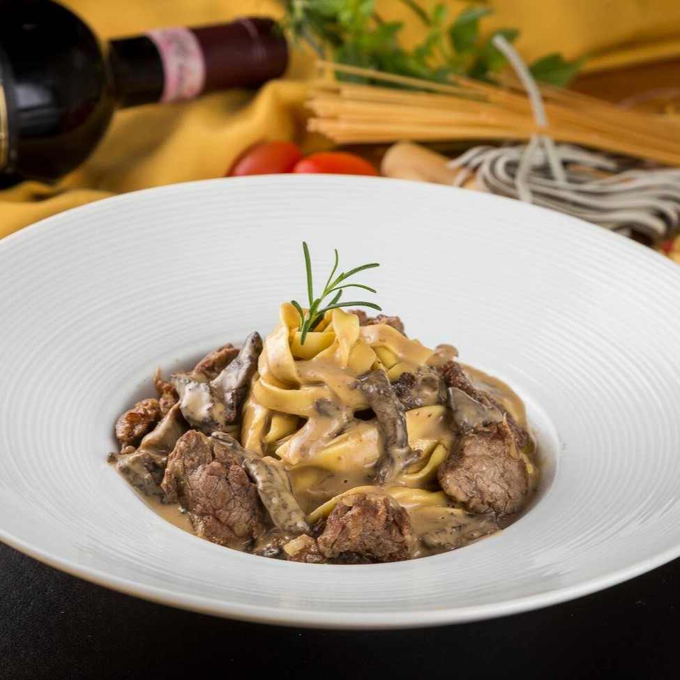 Massa talharim ao molho funghi com cubos de mignon.