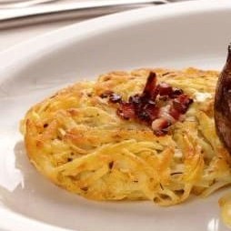 Batata simples (sem recheio) tipo rosti com orégano e bacon.
