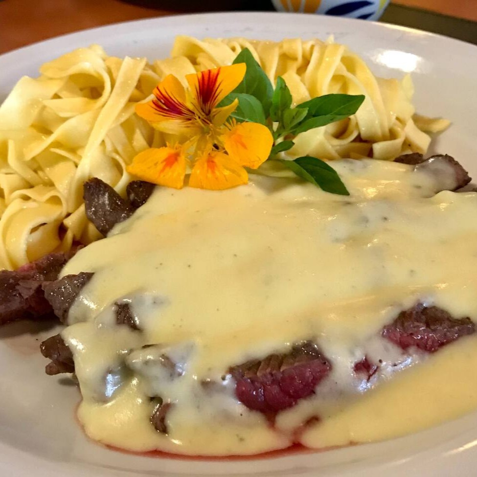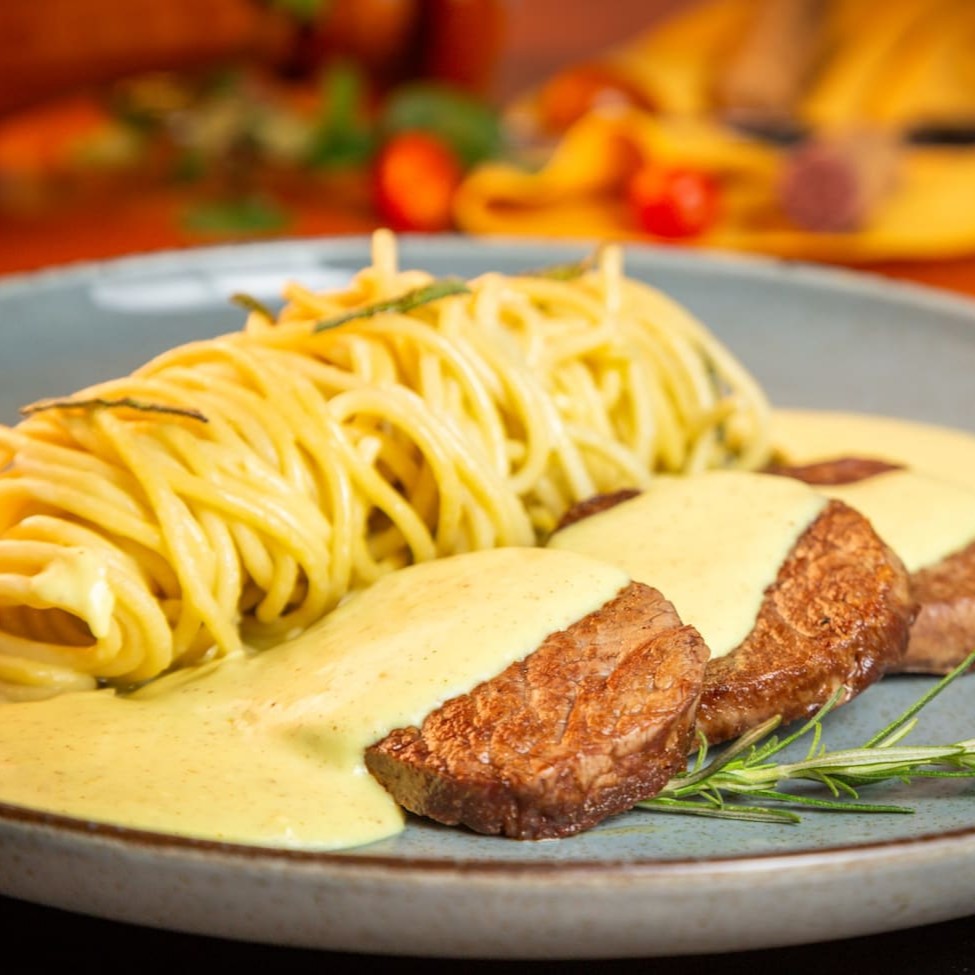 Mignons em tiras ao molho mostarda, acompanha talharim na manteiga.