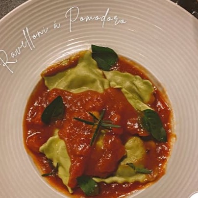 Serve 1 pessoa. Massa verde da casa recheada de mussarela de bufala e tomate seco.