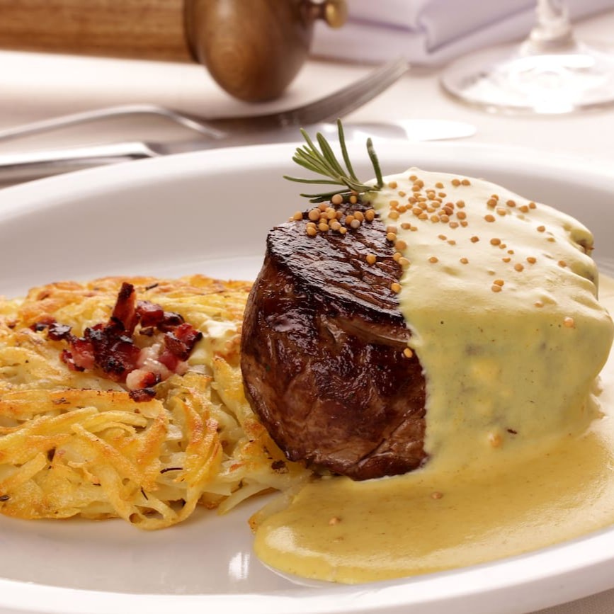 Tiras de mignons com opções de molho ervas finas, mostarda ou madeira.
