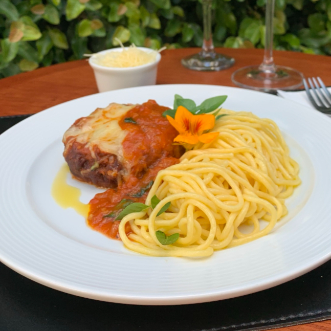 Escalopes de mignon à milanesa, coberto com a massa fusiletti ao molho 4 queijos, fios de molho sugo e gratinado.