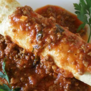 Panqueca de carne com mussarela ao molho bolonhesa. Sugestões para 1 pessoa (450g),2 pessoas (900g), 3 a 4 pessoas (1,3kg).
