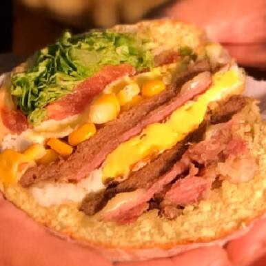 Pão, 2 hambúrgueres da casa, queijo cremoso, alface, tomate, 2 ovos, frango desfiado, bacon, milho, batata palha, maionese e molho verde