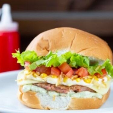Pão, hambúrguer da casa, queijo cremoso, alface, tomate, milho, batata palha, maionese e molho verde