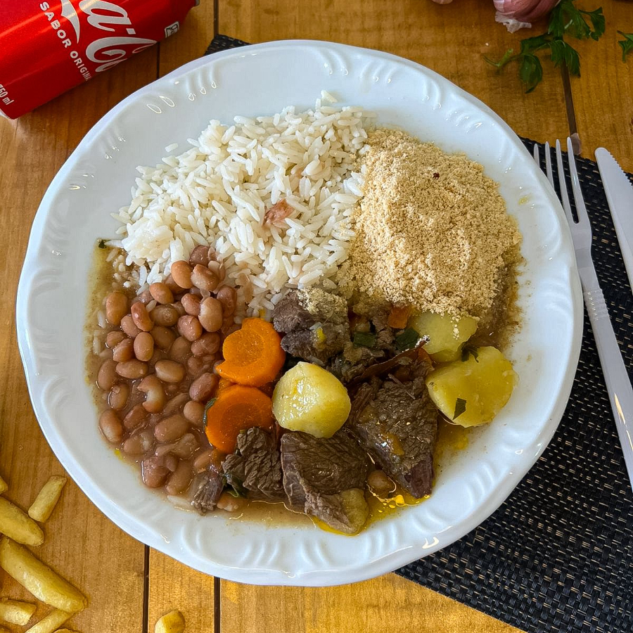 Frango chapeado enfatizando a maciez com deliciosas batata fritas, arroz soltinho e feijão cremoso