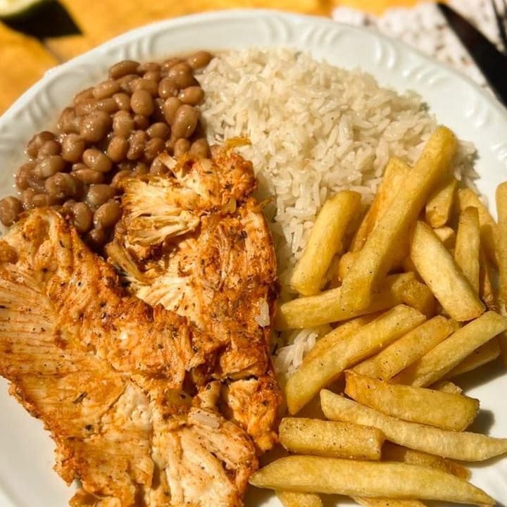 Frango chapeado enfatizando a maciez com deliciosas batata fritas, arroz soltinho e feijão cremoso
