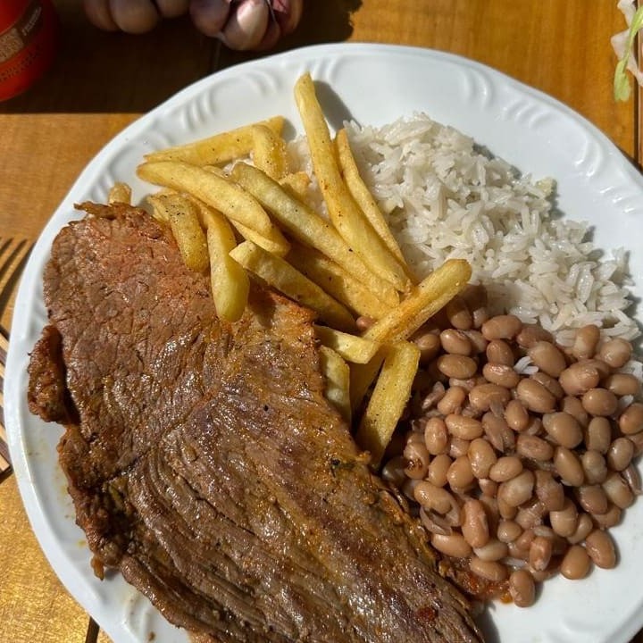 Bife grelhado macio e temperado com deliciosa batata frita, arroz soltinho e feijão cremoso