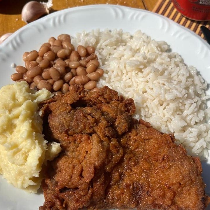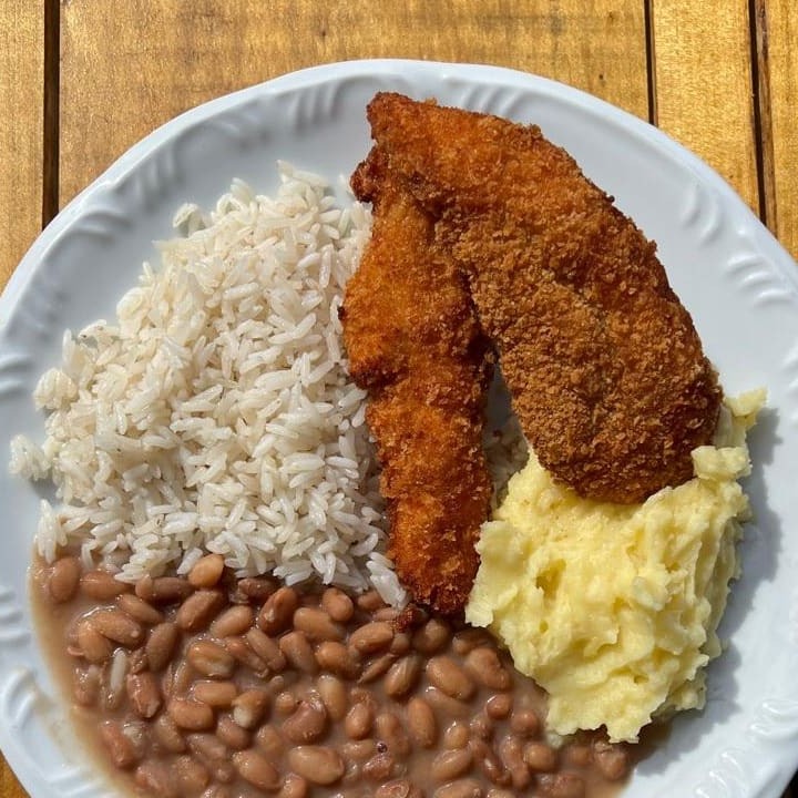 Frango empanado com purê de batata amanteigado, arroz soltinho e feijão cremoso. Marmita P