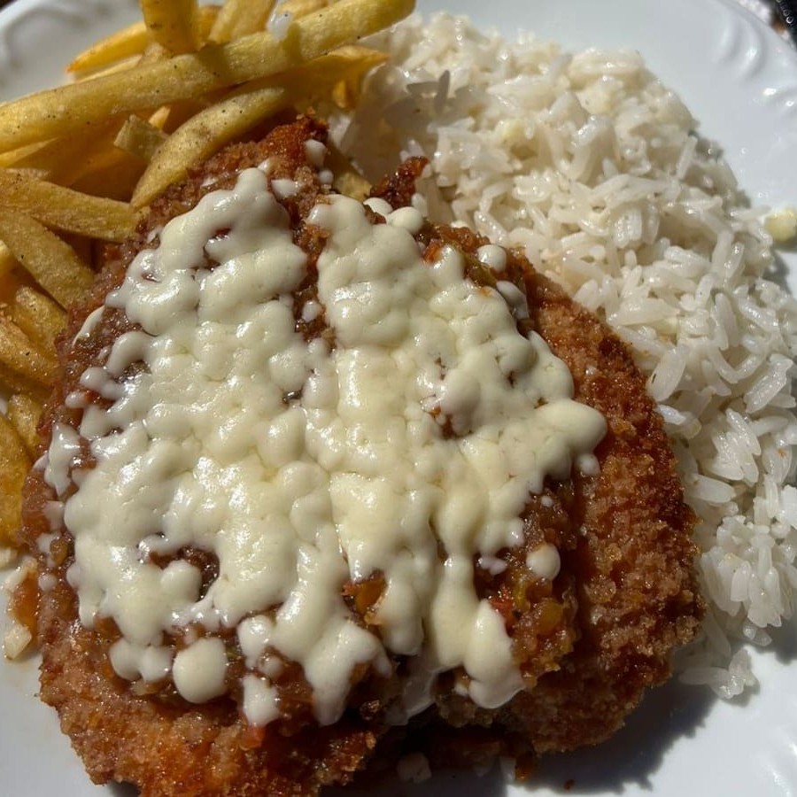 Frango empanado com molho de tomate caseiro, queijo mussarela derretido, deliciosa batata frita e arroz soltinho Marmita P