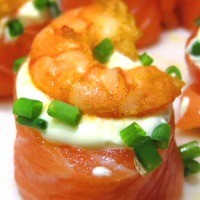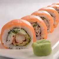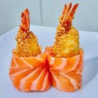 Camarão empanado, pepino, cream cheese, envolta por fatias de salmão.