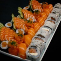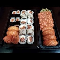 38 peças - 12 uramaki filadelfia, 8 shake, 6 niguiri de salmão, 2 joe de salmão, 10 sashimi de salmão.
