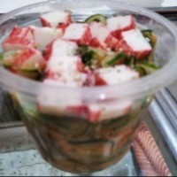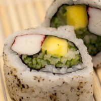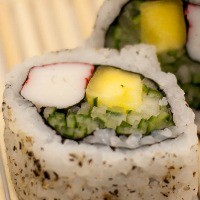 arroz, salmão, cebola roxa, sunomono, manga e gergilin.