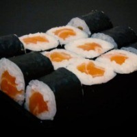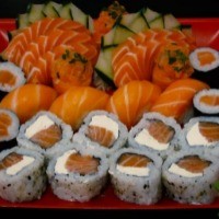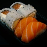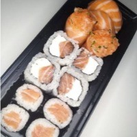 4 uni sashimi salmão, 4 uni de uramaki salmão filadélfia, 4 uni de hossomaki, 2 uni de niguiri de salmão.