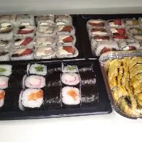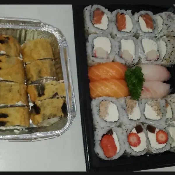 8 sashimi de salmão, 8 sashimi peixe branco, 4 joe, 6 niguiri misto, 4 shake, 4 kani, 4 kapa, 4 filadélfia, 4 califórnia e 4 romeu.