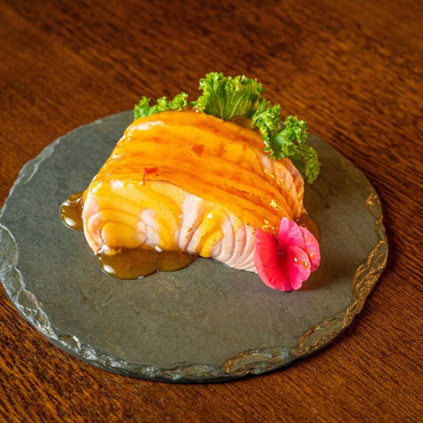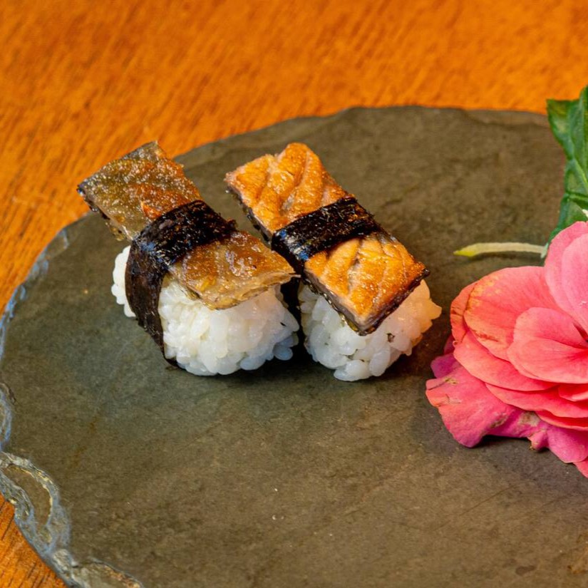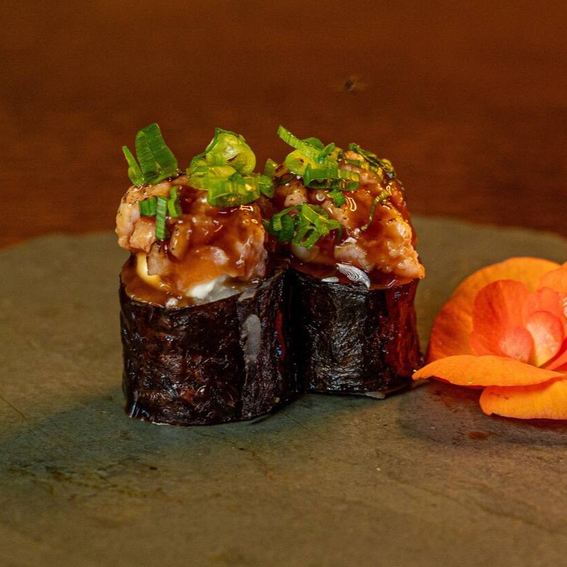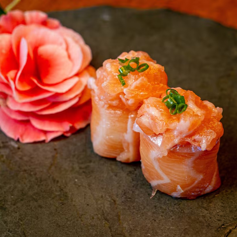 Nori envolto por arroz,lâminas de salmao grelhado na pele e molho tarê