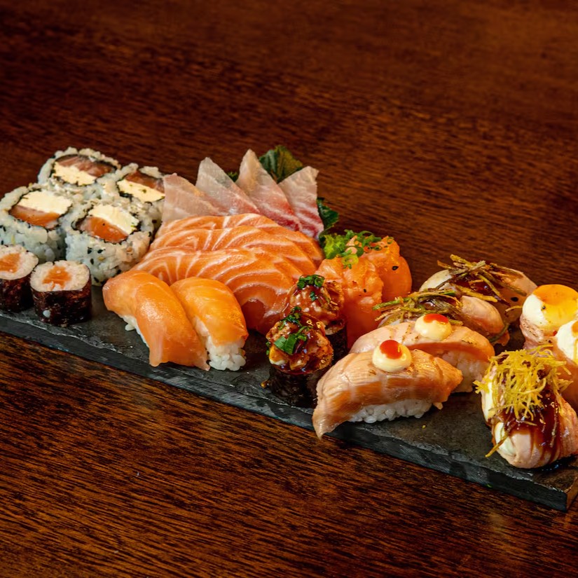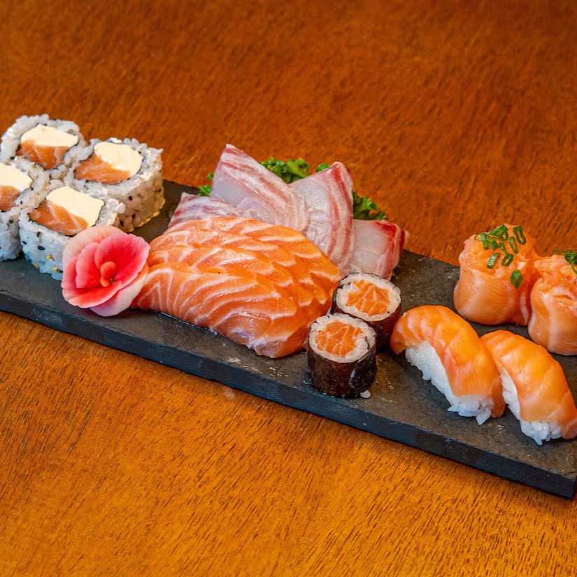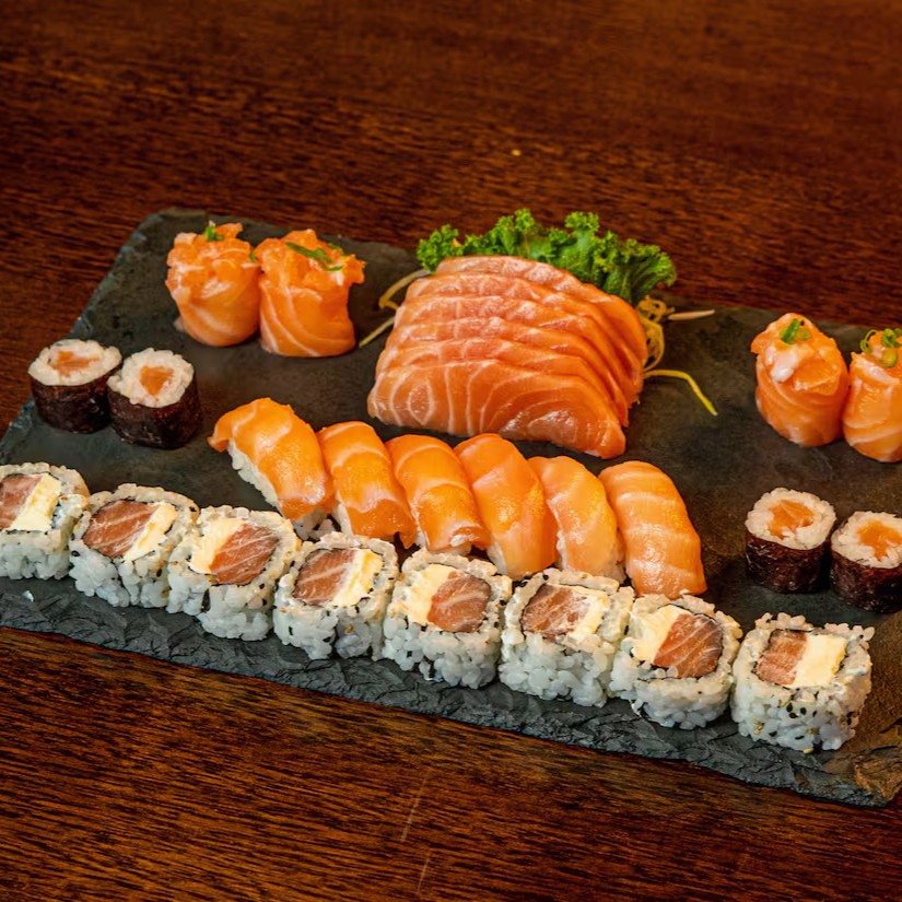 8 uramaki filadélfia, 4 sashimi de salmão, 5 niguiri de salmão, 3 hossomaki shakemaki.