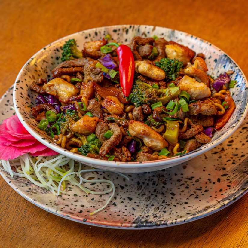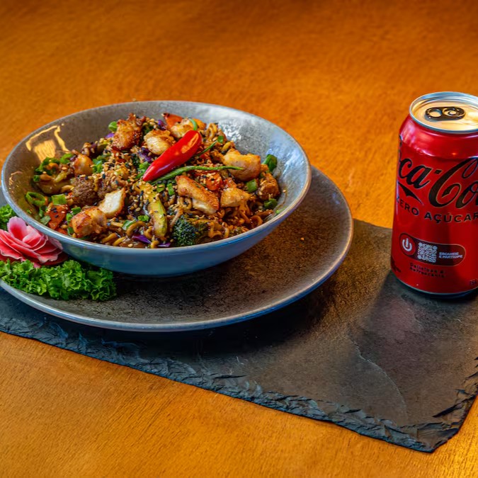 Massa refogada na wok com tiras de frango e de carne, ao toque de óleo de gergelim e molho especial da casa.