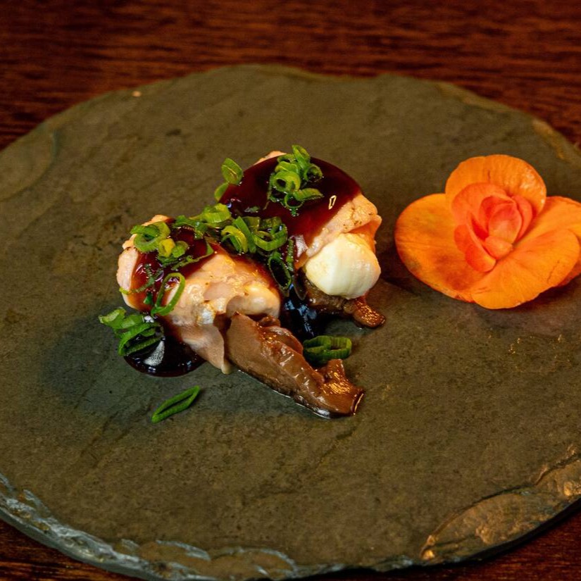 Camarão, shitake salteados no shoyou, palha de alho poró gratinada.