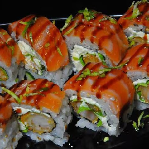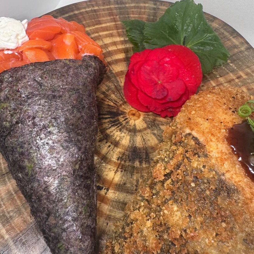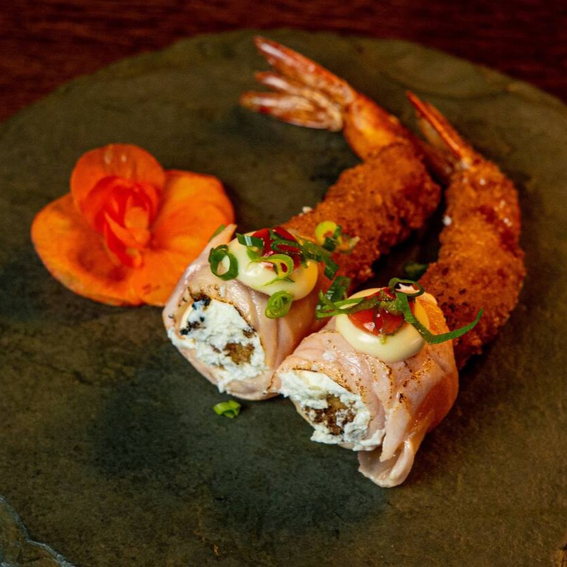 Salmão, camarão empanado, cream cheese e cebolinha.