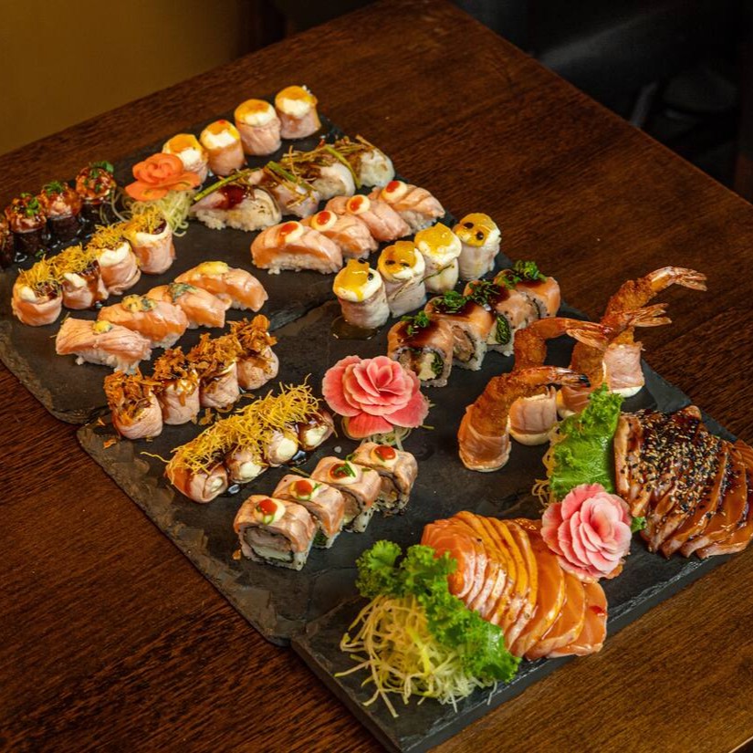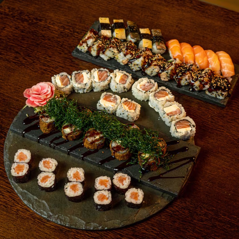 10 sashimi de salmão, 10 sashimi de peixe branco, 10 Hot filadelfia, 6 uramaki filadélfia, 4 uramaki skin, 4 uramaki Swet joe ( Goiabinha), 3 niguiri de salmão, 3 niguiri de peixe branco, 2 joe, 5 hossomaki shakemaki, 5 hossomaki kamaki