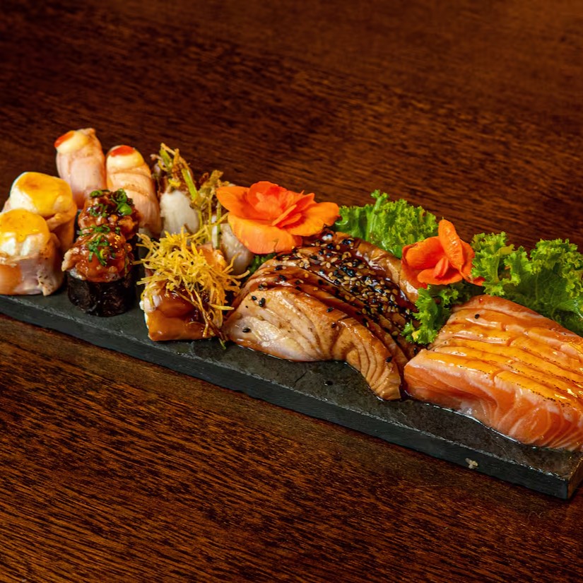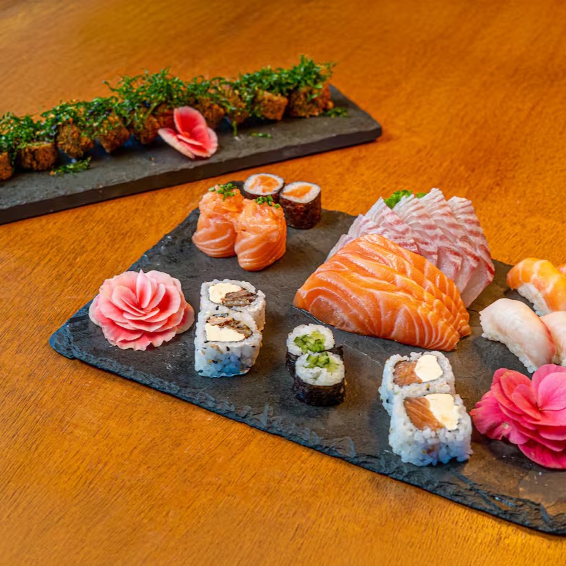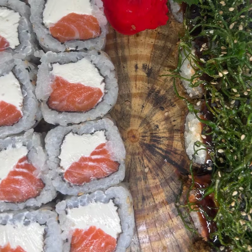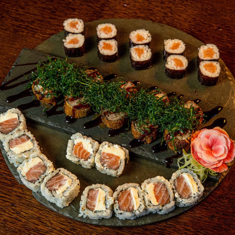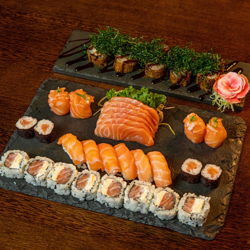 8 uramaki filadelfia; 6 niguiri salmão; 6 sashimi salmão; 4 niguiri joe e 4 hossomaki shakemaki.
