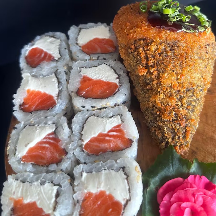 Arroz Japonês, cream cheese, salmão, envolvo por uma casquinha crocante de panko.