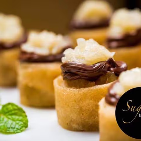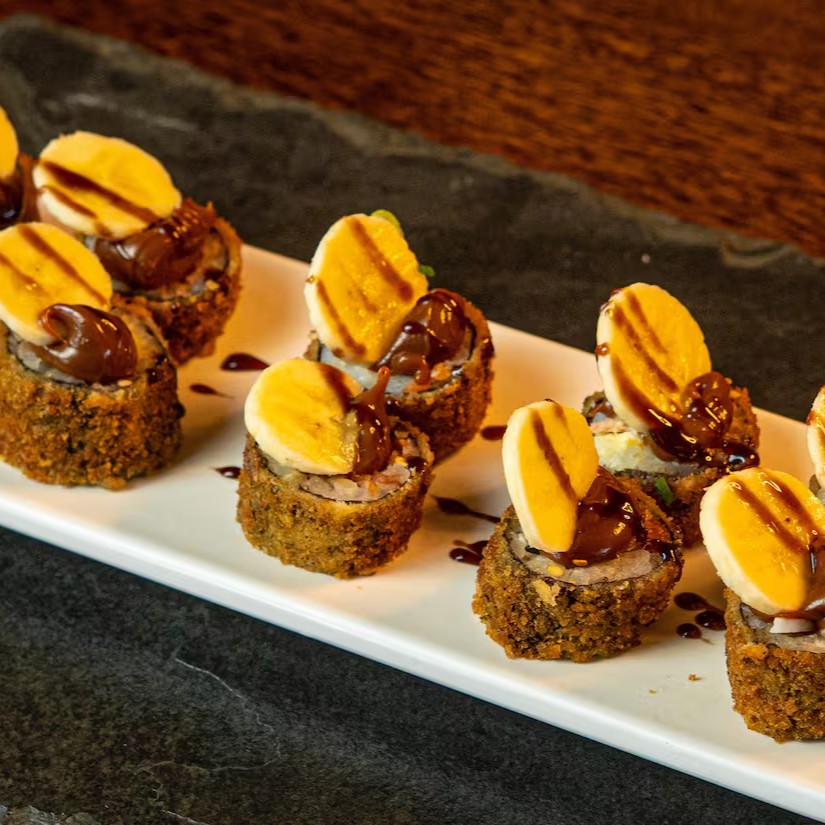 Roll empanado, recheio de abacaxi, cream cheese, cobertura com Nutella.