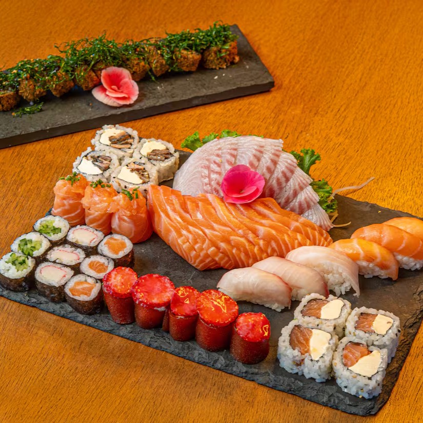 6 sashimi de salmão, 5 sashimi de peixe branco, 8 Hot filadelfia 2 uramaki filadélfia, 2 joe, 2 uramaki skin, 2 hossomaki shakemaki, 2 hossomaki kapamaki, 2 niguiri de salmão, 2 niguiri de peixe branco.