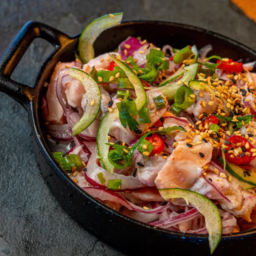 Peixe branco, salmão, cebola roxa marinados no molho da casa.