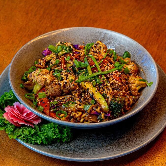 Massa refogada na wok com vegetais salteados ao toque de óleo de gergelim e molho especial da casa.
