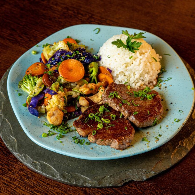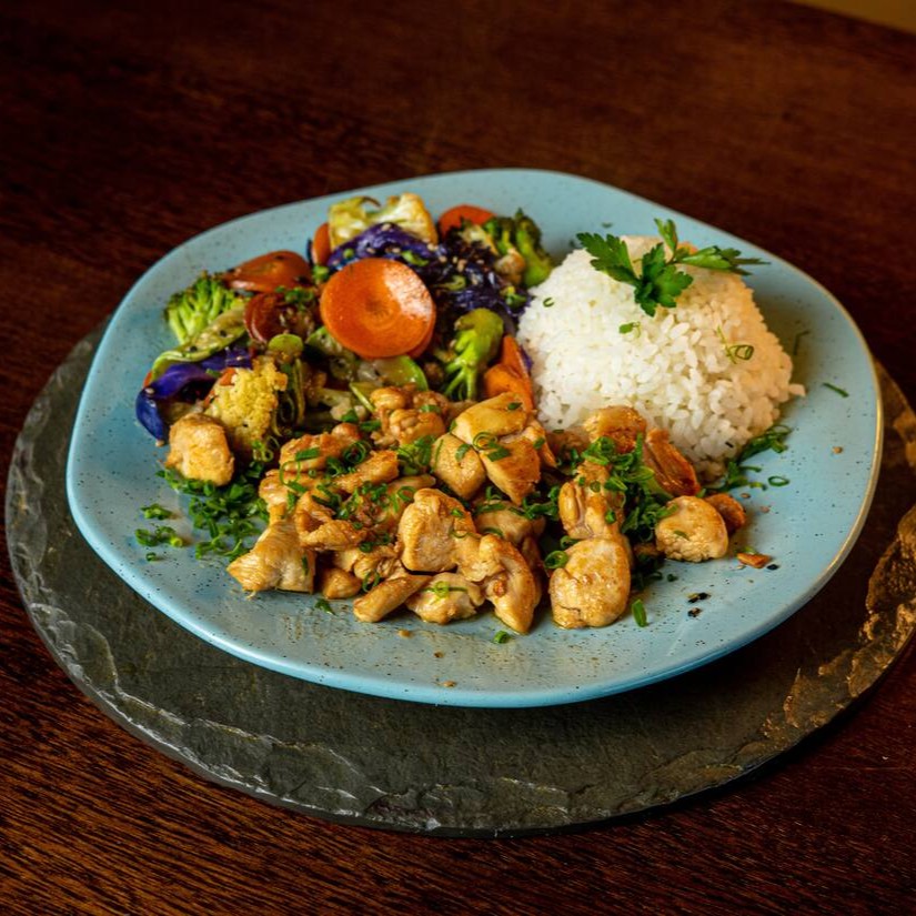 Filet de frango, vegetais salteados no shoyu.