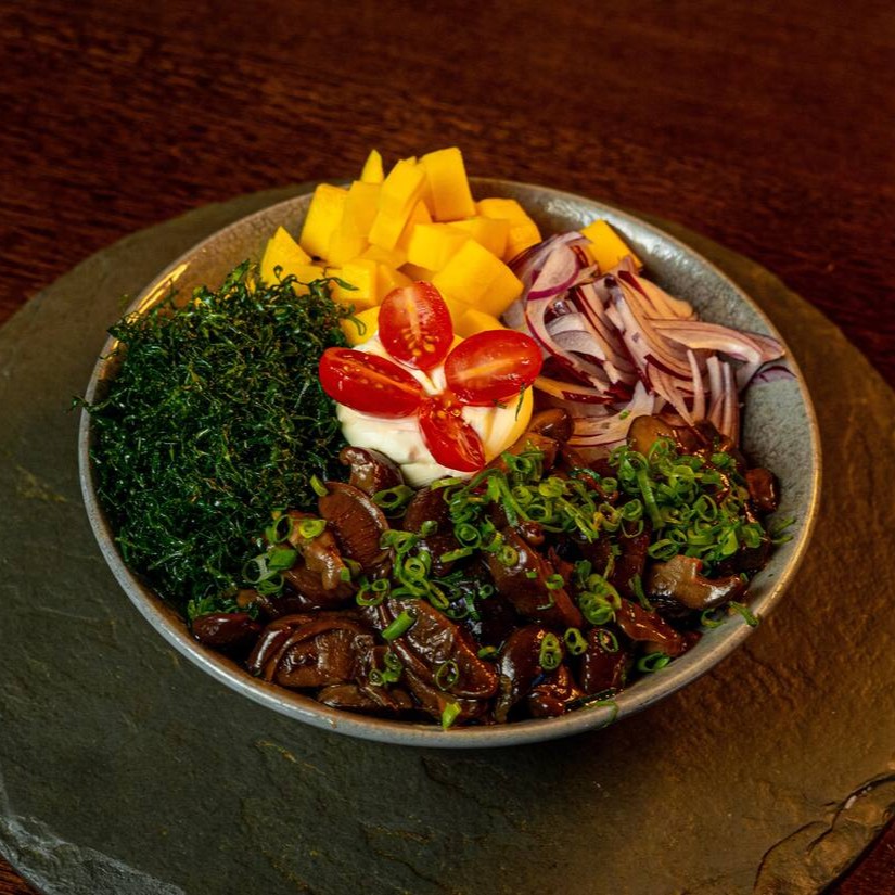 Arroz japonês, cream chesse, shitake na manteiga,cebolinha ,tomate cereja, cebola roxa, couve crispy e manga