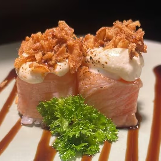 Roll empanado, recheio de salmão, camarão, kani e cream cheese.