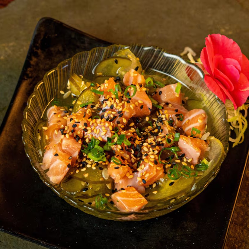 Lâminas de pepino japonês ao molho agridoce, com salmão, pepino, kani e gergelim.