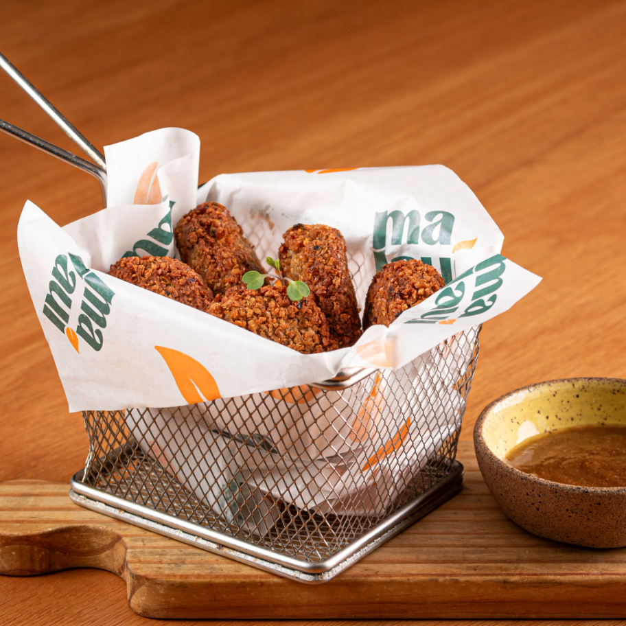 Burrata artesanal, torradinhas crocantes de pão de fermentação natural, mix de folhas, mini tomates assados e nosso vinagrete de manjericão.