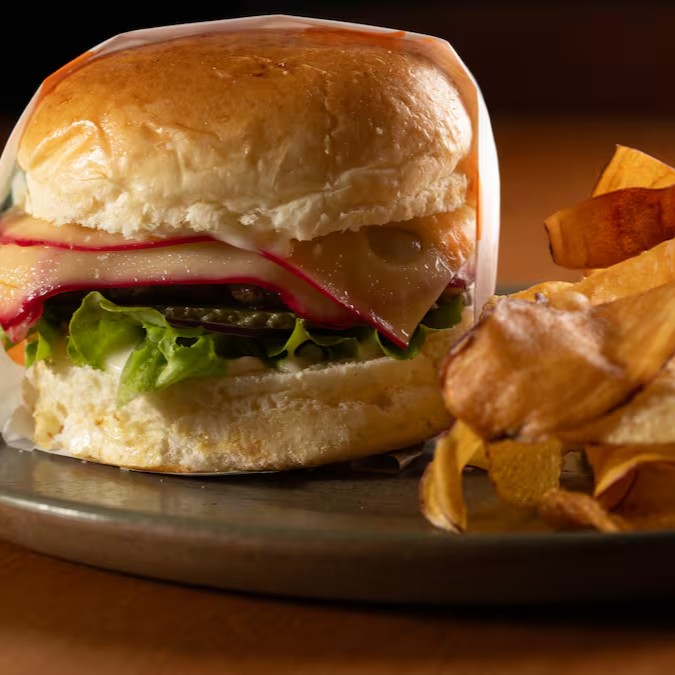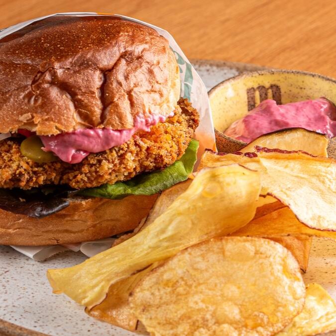 Pão brioche, frango empanado na panko com especiarias, maionese de beterraba, cebola roxa e mix de folhas temperadas com vinagrete de manjericão. Acompanha chips de raízes.