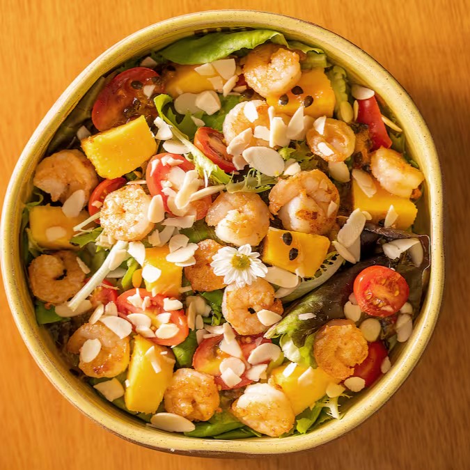 Mix de folhas da estação, tomate cereja, manga, amêndoas laminadas, camarão grelhado (130g) e molho agridoce de maracujá com pimenta rosa. *Sem Lactose / Sem Glúten.