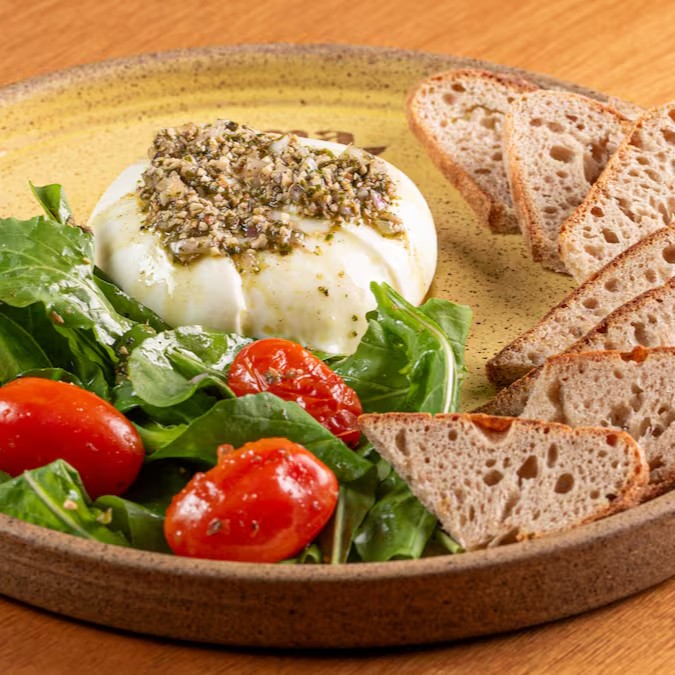 Burrata artesanal, torradinhas crocantes de pão de fermentação natural, mix de folhas, mini tomates assados e nosso vinagrete de manjericão.