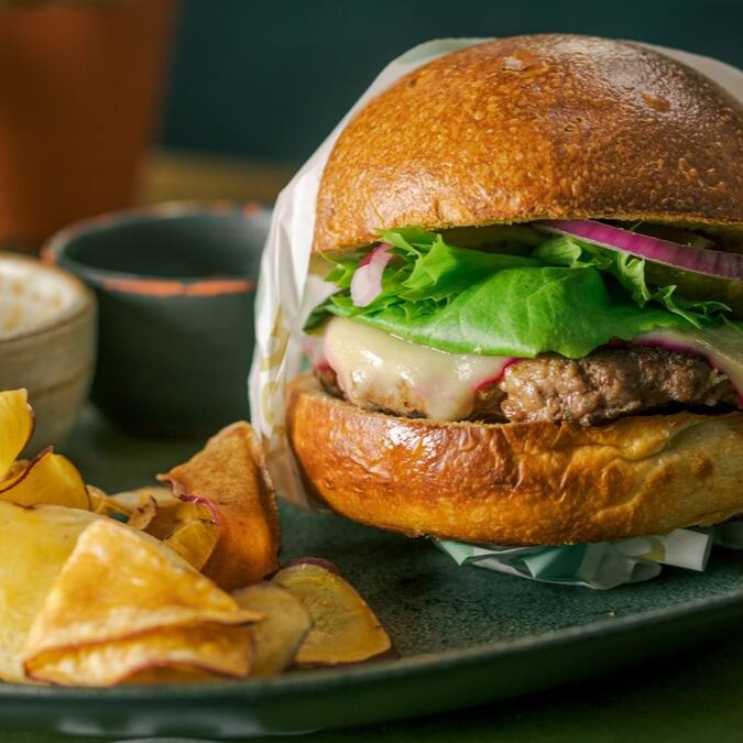 Pão brioche feito de forma artesanal e fermentação natural, blend de carnes selecionadas, tempero da casa, mix de mini folhas verdes da época, cebola roxa, pepino em conserva, queijo gouda e nossa maionese.