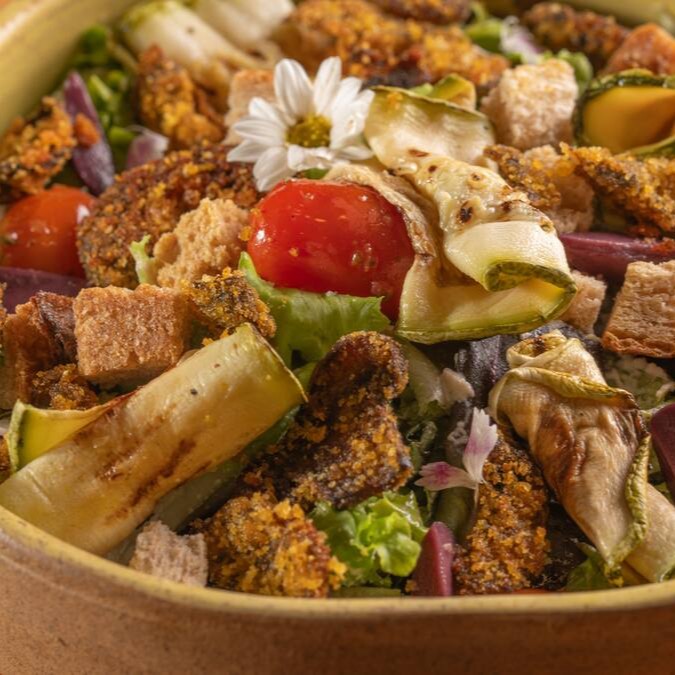Mix de folhas da estação temperadas com molho de queijo vegano, azeitonas pretas, tomate confit, abobrinha grelhada, crispy de cogumelos e croutons.