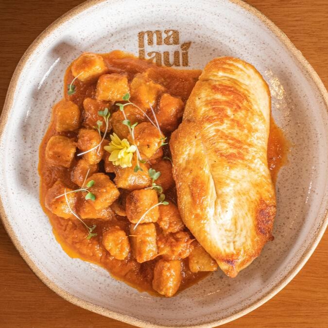 Nhoque de batatas (doce / asterix) e molho de tomate da casa, acompanhado de filé de frango grelhado (120gr). Acompanha mini salada temperada com nosso vinagrete de manjericão (entrada).