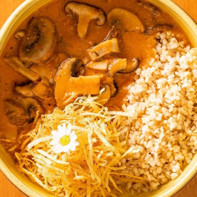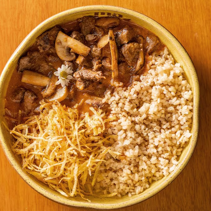 Delicioso strogonoff de cogumelos paris, portobello e shitake (120g), servido com arroz cateto integral e batata palha artesanal. Acompanha mini salada temperada com nosso vinagrete de manjericão (entrada).