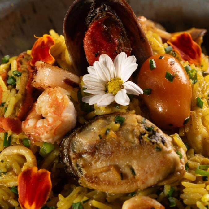 Deliciosa combinação de arroz basmati, cozido em caldo de legumes com açafrão e finalizado com frutos do mar (camarão, cação, lula e mariscos). Acompanha mini salada temperada com nosso vinagrete de manjericão (entrada). Contém lactose / Sem glúten.