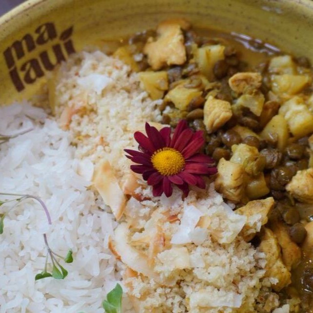 Cubos de frango (120g), especiarias, leite de coco, lentilha e abacaxi, servido com arroz basmati e farofa com lascas de coco. Acompanha mini salada temperada com nosso vinagrete de manjericão (entrada).