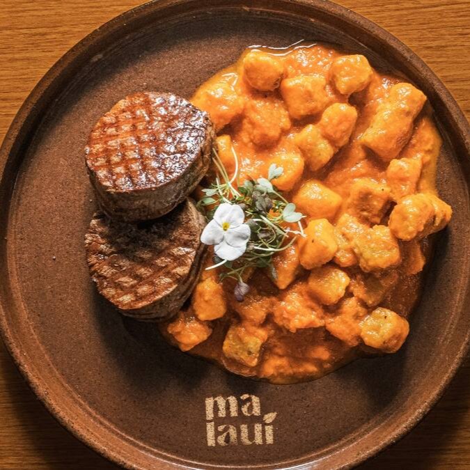 Nhoque de batatas (doce / asterix) e molho de tomate da casa, acompanhado de medalhão de Filé Mignon (160gr). Acompanha mini salada temperada com nosso vinagrete de manjericão (entrada).