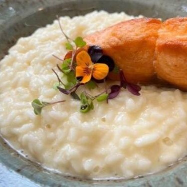 Arroz arbóreo cozido no vinho branco, finalizado com limão siciliano, manteiga e parmesão capa preta. Salmão grelhado (140g).