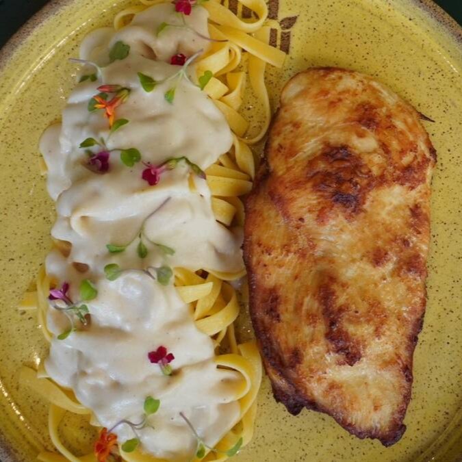 Talharim artesanal, molho bechamel a base de castanhas com seleção de queijos, acompanhado de filé de frango grelhado. Acompanha mini salada temperada com nosso vinagrete de manjericão (entrada).